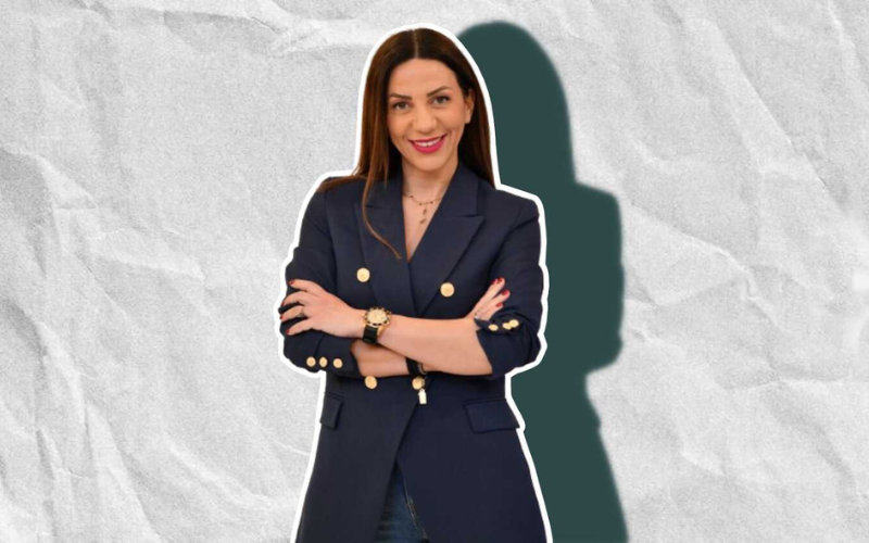 Τα μαλλιά της, sleek και ίσια, πέφτουν κομψά στους ώμους, δίνοντας καθαρή γεωμετρία στην εικόνα. Το μακιγιάζ εστιάζει σε έντονο βλέμμα με smokey εφέ και σαγηνευτικά χείλη σε berry απόχρωση, που αναδεικνύουν τη δυναμικότητά της.