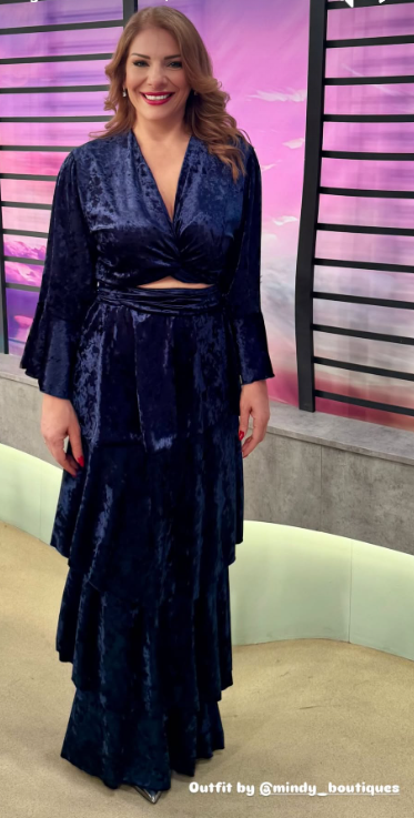 Το navy μπλε βελούδο βρίσκει την ιδανική του εκπρόσωπο στην Αγγελική Νικηφόρου, με ένα outfit που αποπνέει διακριτική πολυτέλεια και vintage γοητεία.