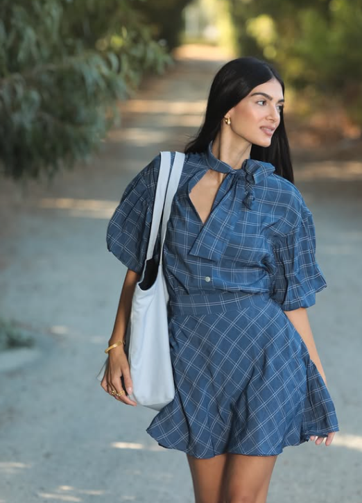 Με καρό φόρεμα σε μπλε τόνους που δίνει μια παιχνιδιάρικη αλλά και sophisticated αύρα, η Ανδρέα επιλέγει balloon μανίκια και διακριτικό φιόγκο στο λαιμό που προσδίδουν μια ρετρό αίσθηση, ενώ η γραμμή του φορέματος αγκαλιάζει τη σιλουέτα με θηλυκότητα και άνεση.