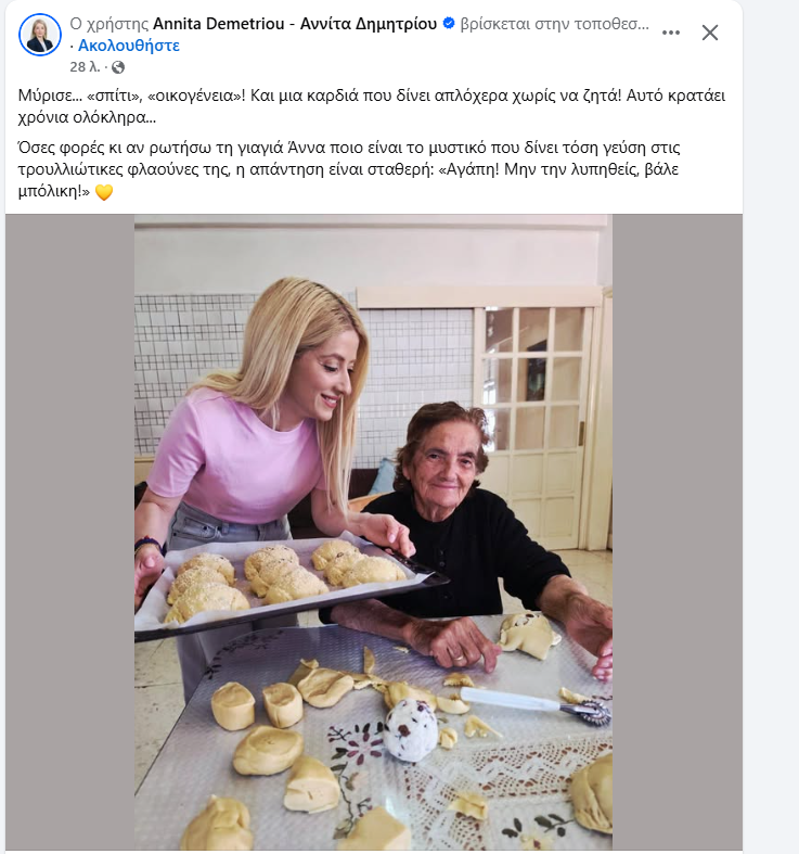 Με μια ζεστή και ανθρώπινη ανάρτηση, η Πρόεδρος της Βουλής και Πρόεδρος του ΔΗΣΥ, Αννίτα Δημητρίου, μοιράστηκε στιγμές από πασχαλινά ζυμώματα, αναδεικνύοντας τη σημασία της παράδοσης και της κοινότητας.
