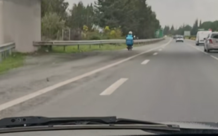 Εικόνες που προκαλούν έντονο προβληματισμό καταγράφηκαν σε αυτοκινητόδρομο, όπου διανομέας κινείται με μηχανάκι – μοτόποδήλατο ανάμεσα σε διερχόμενα οχήματα, σε δρόμο υψηλής ταχύτητας όπου τέτοια παρουσία θεωρείται επικίνδυνη.