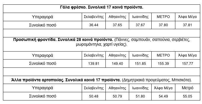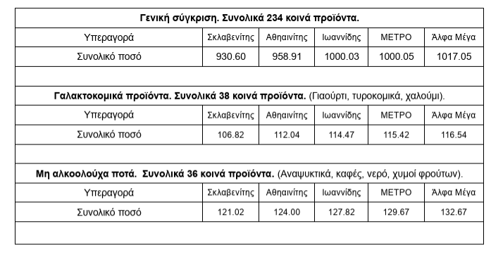 Συγκεκριμένα, από τους 478 κωδικούς προϊόντων που παρακολουθεί το e-kalathi, εντοπίστηκαν 241 κοινοί κωδικοί σε γνωστές αλυσίδες όπως οι Σκλαβενίτης, Αθηαινίτης, Ιωαννίδης, Μετρό και Άλφα Μέγα. Η ανάλυση δείχνει ότι το συνολικό κόστος των προϊόντων παραμένει σχεδόν σταθερό ανά επαρχία, ενώ μικρές αποκλίσεις καταγράφονται ανά κατηγορία.