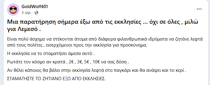Σύμφωνα με την ανάρτηση, άτομα βρίσκονται έξω από ναούς και ζητούν χρήματα από πιστούς που εξέρχονται από την εκκλησία, κάτι που, όπως υποστηρίζει, δημιουργεί μια άβολη και πιεστική κατάσταση.