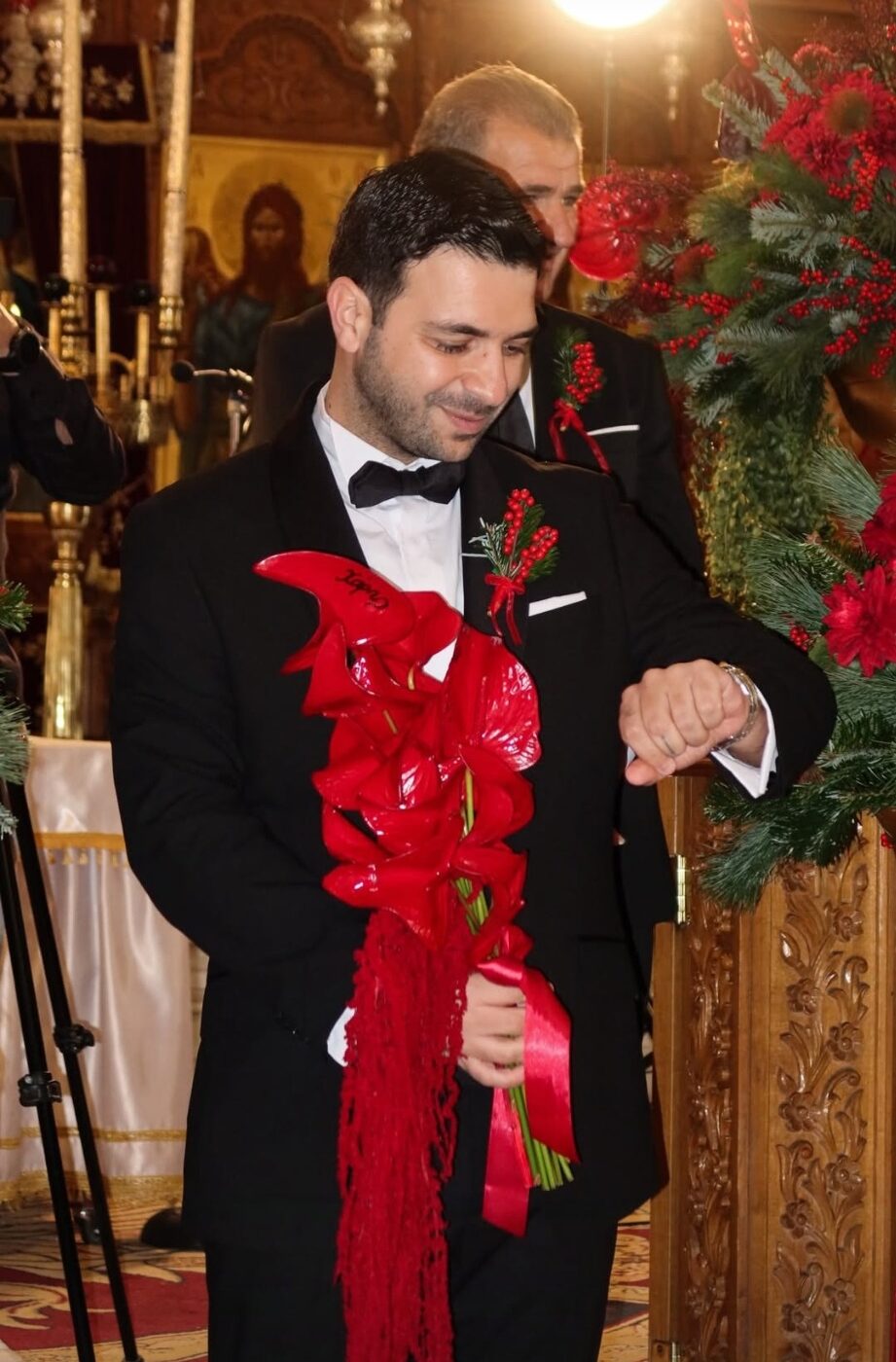 Ο Χάρης, με total black-tie εμφάνιση και τον iconic red ανθοστολισμό στο πέτο, ολοκλήρωσε ιδανικά την εικόνα ενός σύγχρονου classic γαμπρού.