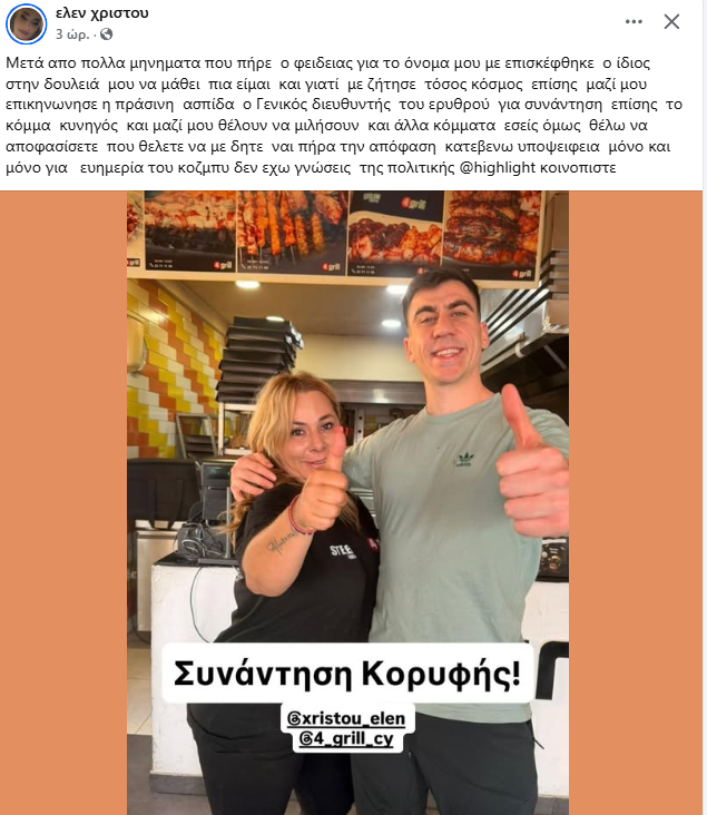Στην ανάρτησή της αναφέρει ότι ο Φειδίας την επισκέφθηκε στην εργασία της για να τη γνωρίσει και να μάθει περισσότερα για τη δράση της, ενώ, όπως αποκαλύπτει, δέχθηκε και προτάσεις από πολιτικά κόμματα για να κατέλθει υποψήφια στις εκλογές.