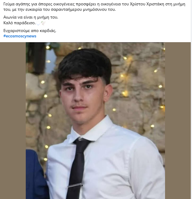 Με δάκρυα στα μάτια αλλά και με μια πράξη γεμάτη αγάπη, η οικογένεια του 19χρονου Χρίστου Χριστάκη, που έφυγε πρόωρα από τη ζωή ύστερα από τραγικό ατύχημα, τίμησε τη μνήμη του με έναν διαφορετικό τρόπο: προσφέροντας γεύμα σε άπορες οικογένειες.