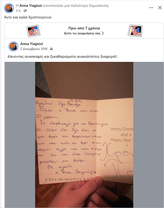 «Κάνοντας ανασκαφές και ξεκαθαρίσματα, ανακαλύπτεις διαφορά!!», έγραψε με χιούμορ, συνοδεύοντας το μήνυμά της με τη φωτογραφία του σημειώματος, όπου η μικρή τότε Άννα ζητούσε τα δώρα της για τα Χριστούγεννα με εκείνο το αμίμητο παιδικό ύφος που μόνο ένα παιδί μπορεί να έχει.
