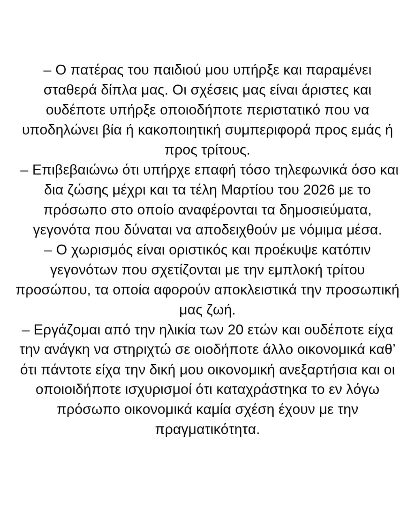 – Ο πατέρας του παιδιού μου υπήρξε και παραμένει σταθερά δίπλα μας. Οι σχέσεις μας είναι άριστες και ουδέποτε υπήρξε οποιοδήποτε περιστατικό που να υποδηλώνει βία ή κακοποιητική συμπεριφορά προς εμάς ή προς τρίτους.
