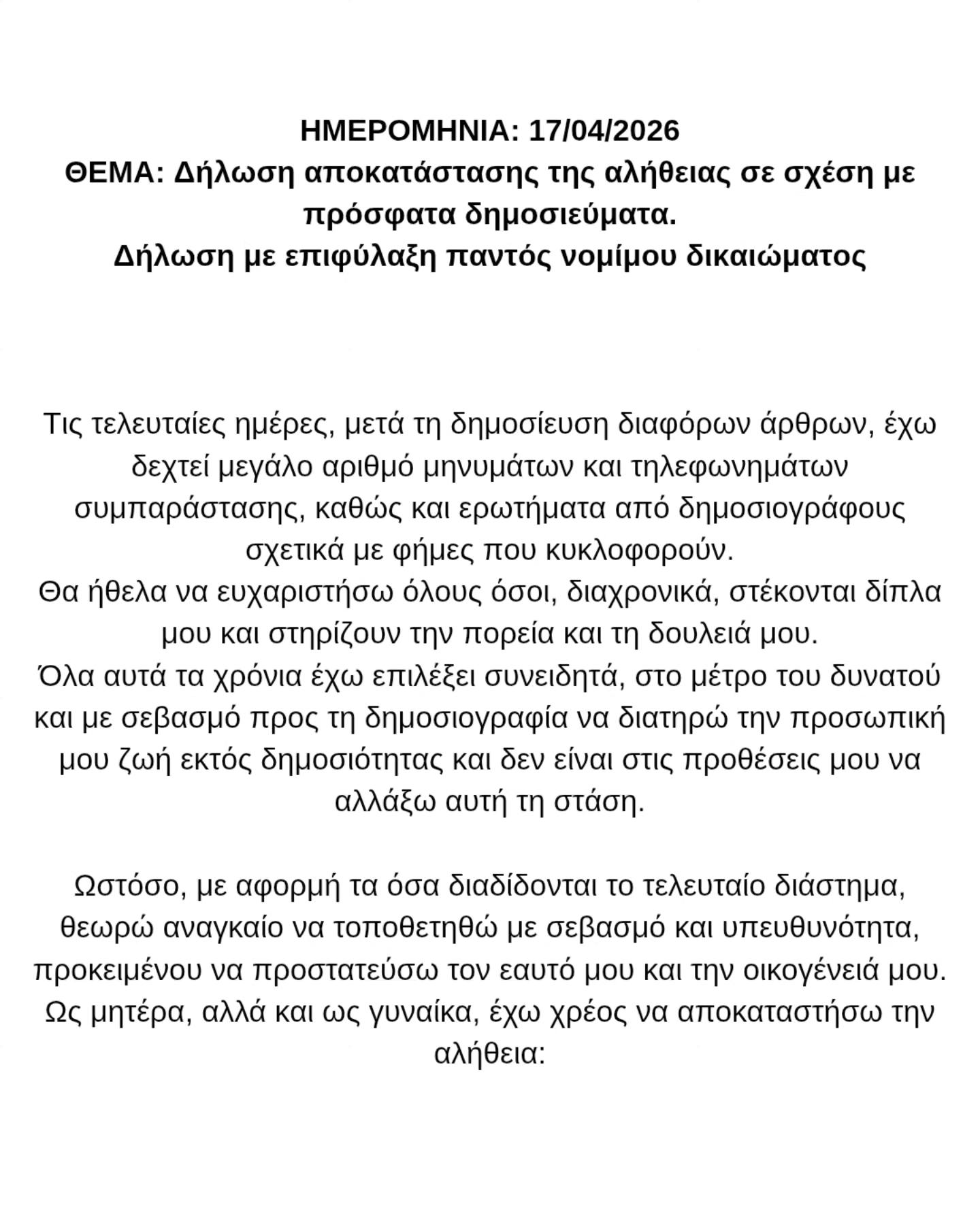 Παράλληλα, δηλώνω ότι έχω ήδη προβεί στις απαραίτητες νομικές ενέργειες για την προστασία μου και επιφυλάσσομαι για κάθε νόμιμο δικαίωμά μου σε περίπτωση που συνεχιστεί η διασπορά ανακριβών ή δυσφημιστικών ισχυρισμών, τόσο για εμένα όσο και για τον πατέρα του παιδιού μου, του οποίου είναι όλα σε γνώση και προτίθεται και ο ίδιος να προβεί στην λήψη νομικών μέτρων στην περίπτωση που αυτό καταστεί αναγκαίο.