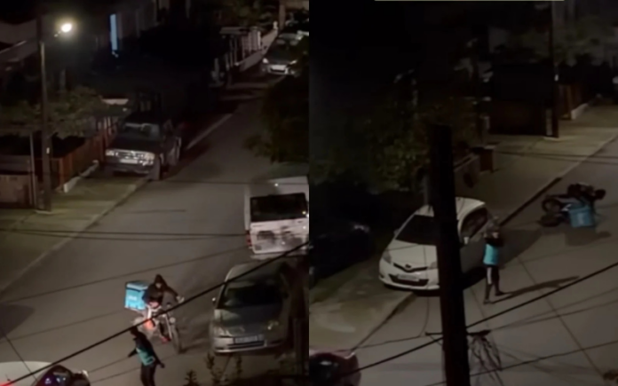 Συγκεκριμένα, στο βίντεο καταγράφεται άγνωστος άντρας να έχει ήδη πάρει το ηλεκτρικό ποδήλατο του ντελιβερά, ενώ ο δεύτερος προσπαθεί να το πάρει πίσω. Στο σημείο βρίσκεται όχημα, το οποία φαίνεται ότι σχετίζεται με τον δράστη.