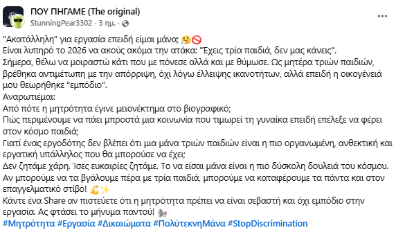 Η δημοσίευση συγκέντρωσε εκατοντάδες κοινοποιήσεις και σχόλια, με γυναίκες να μοιράζονται παρόμοιες εμπειρίες και να επιβεβαιώνουν ότι το πρόβλημα παραμένει επίκαιρο. Ότι ακόμη και σήμερα, πολλές μητέρες νιώθουν πως πρέπει να απολογηθούν για την οικογένειά τους όταν διεκδικούν μια θέση εργασίας.