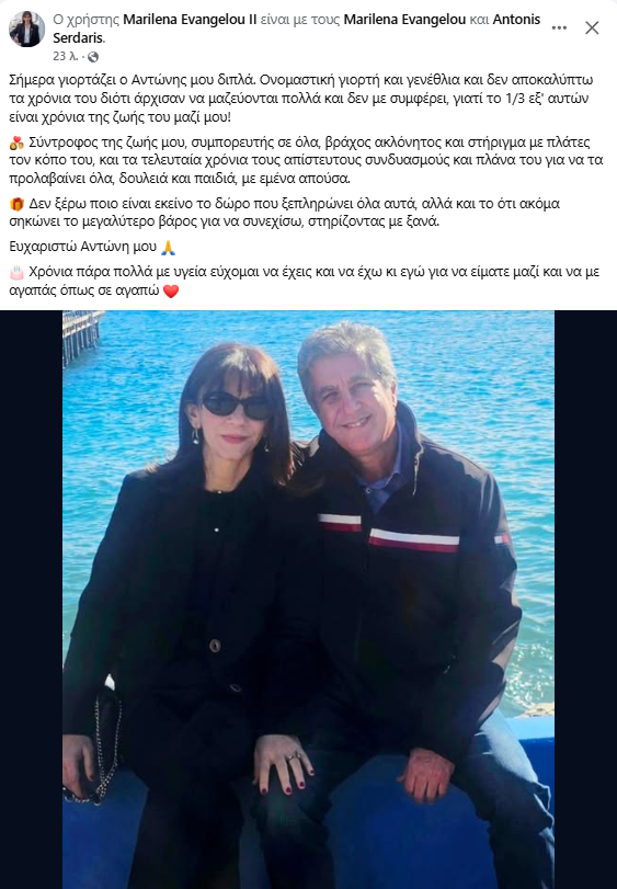 Χωρίς ημερομηνίες και αριθμούς, αλλά με έμφαση στην ουσία, η Μαριλένα Ευαγγέλου υπενθύμισε πως πίσω από τη δημόσια εικόνα υπάρχει μια γυναίκα που εκτιμά βαθιά τη συντροφικότητα, την οικογένεια και την αντοχή που χτίζεται μαζί, μέρα με τη μέρα