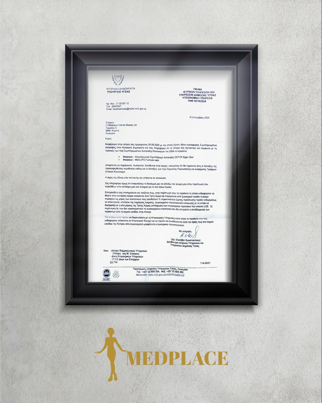 Tο επίσημο έγγραφο έγκρισης της MedLipo™ Formula από το Υπουργείο Υγείας της Κυπριακής Δημοκρατίας ακολουθεί.