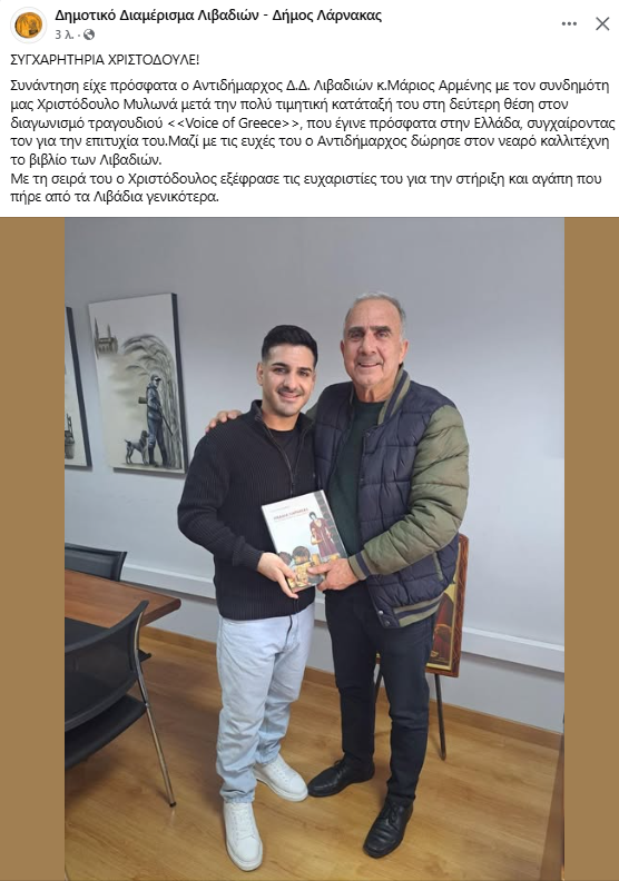 Ο νεαρός καλλιτέχνης, που έχει ξεχωρίσει με τη συμμετοχή του στον διαγωνισμό τραγουδιού «The Voice of Greece», βρέθηκε στην Ελλάδα εκπροσωπώντας επάξια τον τόπο του. Κατά τη διάρκεια της συνάντησης, ο Αντιδήμαρχος τού ευχήθηκε καλή συνέχεια και του προσέφερε το βιβλίο των Λιβαδιών, ως ένδειξη στήριξης και αναγνώρισης.