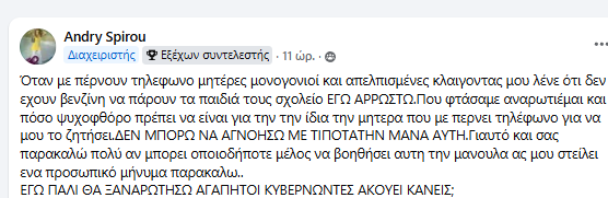 Όπως αναφέρει, δέχεται τηλεφωνήματα από μονογονείς που δηλώνουν αδυναμία ακόμη και να μετακινηθούν, καθώς δεν έχουν χρήματα ούτε για καύσιμα, προκειμένου να πάρουν τα παιδιά τους από το σχολείο. «Δεν έχω βενζίνη να πάρω το παιδί μου», είναι, όπως σημειώνει, μια φράση που ακούει όλο και πιο συχνά, περιγράφοντας μια σκληρή πραγματικότητα.