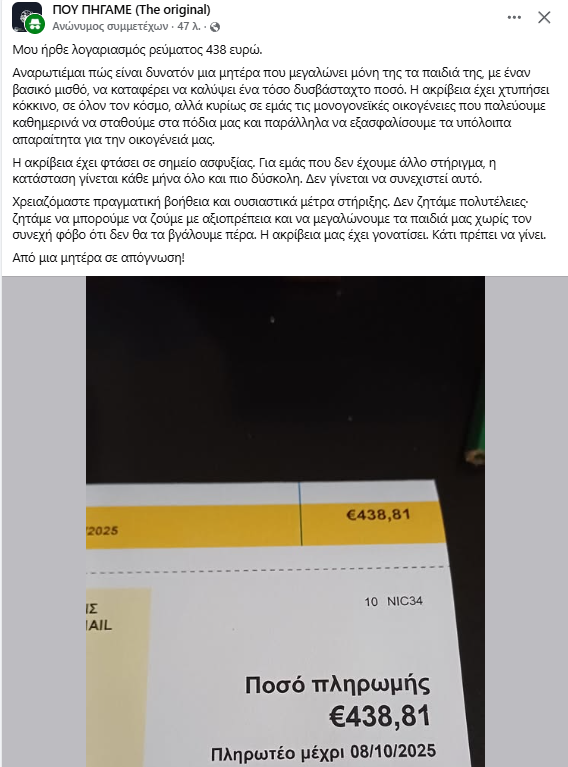 Με ανάρτησή της στη σελίδα «ΠΟΥ ΠΗΓΑΜΕ (The original)» στο Facebook, μια μητέρα μοιράστηκε τη δυσκολία που βιώνει μεγαλώνοντας μόνη τα παιδιά της, όταν κλήθηκε να πληρώσει λογαριασμό ρεύματος ύψους 438 ευρώ.