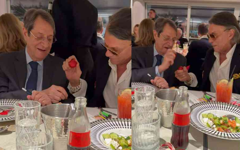 Οι δύο άντρες τσουγκρίζουν αυγά, όπως επιτάσσει το έθιμο του Πάσχα, με τον Νίκο Αναστασιάδη να στέφεται νικητής στο τσούγκρισμα. «Η μόνη περίπτωση που μπορώ να τα τσουγκρίσω με τον Πρόεδρο, είναι το Πάσχα», ακούγεται να λέει χαριτολογώντας ο Ηλίας Ψινάκης στην αρχή του βίντεο.