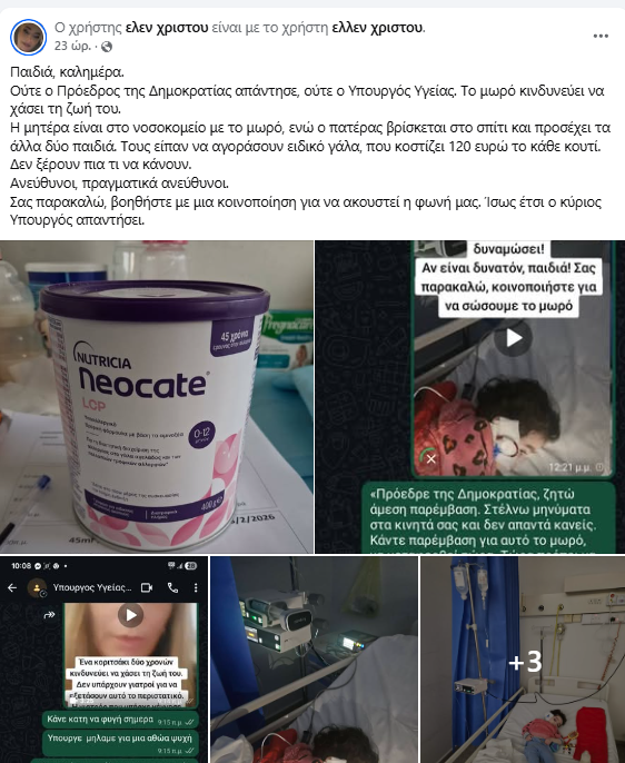 Ιδιαίτερη αναφορά γίνεται στο ειδικό γάλα που, σύμφωνα με ιατρικές οδηγίες, χρειάζεται άμεσα το μωρό. Το κόστος του φτάνει τα 120 ευρώ ανά κουτί, ποσό που η οικογένεια δηλώνει αδυναμία να καλύψει, χωρίς κρατική στήριξη ή άμεση παρέμβαση. «Δεν ξέρουν πια τι να κάνουν», αναφέρεται χαρακτηριστικά, με τη λέξη «ανευθυνότητα» να επαναλαμβάνεται ως κραυγή αγανάκτησης.