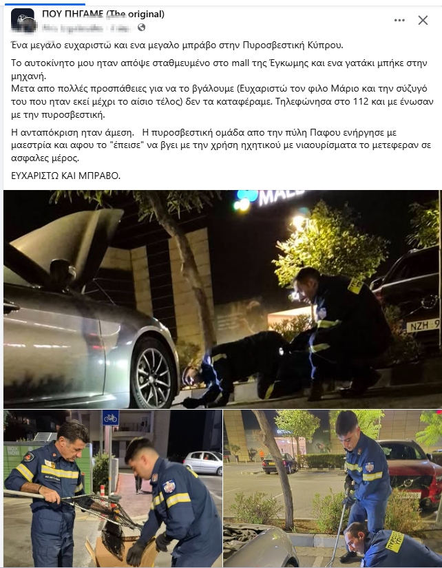 Ένα μικρό γατάκι βρέθηκε παγιδευμένο στη μηχανή αυτοκινήτου, το οποίο ήταν σταθμευμένο στο Mall της Έγκωμης, προκαλώντας αναστάτωση αλλά και μια συγκινητική επιχείρηση διάσωσης.