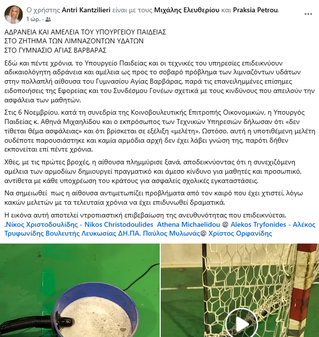 Η κ. Άντρη Καντζιλέρη, μέσω δημόσιας ανάρτησής της, στρέφεται ευθέως κατά του Υπουργείου Παιδείας και των Τεχνικών Υπηρεσιών, τονίζοντας πως παρά τις επανειλημμένες ειδοποιήσεις της Εφορείας και του Συνδέσμου Γονέων, «καμία αρμόδια αρχή δεν έλαβε γνώση ή δεν έπραξε το παραμικρό».