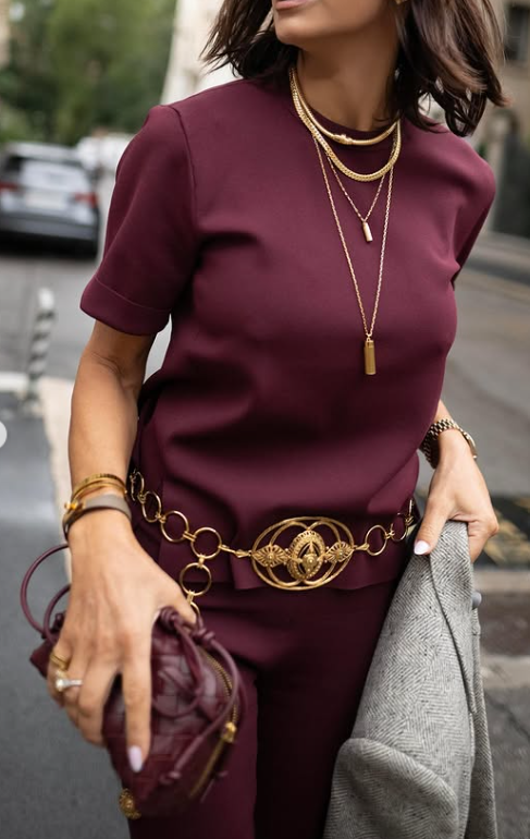 Η ζώνη με τις χρυσές λεπτομέρειες λειτουργεί ως κεντρικό κομμάτι που αναδεικνύει τη σιλουέτα, ενώ η μικρή πλεκτή τσάντα σε μπορντό τονίζει την πολυτέλεια της εικόνας. Τα nude ψηλοτάκουνα προσθέτουν θηλυκότητα, ενώ τα κομψά layered χρυσά κοσμήματα δίνουν λάμψη χωρίς να υπερφορτώνουν το look.