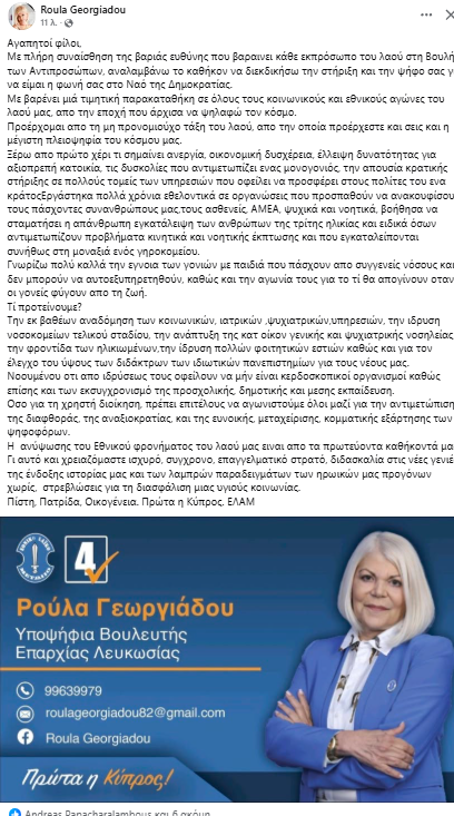 Με λόγο αιχμηρό αλλά και βαθιά προσωπικό, η Ρούλα Γεωργιάδου, πρωην ραδιοφωνικός παραγωγός και πρώην βουλεύτρια, απευθύνεται στους πολίτες, ανακοινώνοντας την πρόθεσή της να διεκδικήσει την ψήφο τους για τη Βουλή των Αντιπροσώπων. Επικαλούμενη τις εμπειρίες της από την καθημερινότητα και τη μακρόχρονη ενασχόλησή της με κοινωνικά ζητήματα, στέλνει μήνυμα ευθύνης, κοινωνικής ευαισθησίας αλλά και ανάγκης για ουσιαστικές αλλαγές σε καίριους τομείς του κράτους.