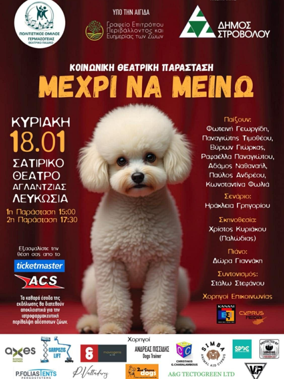 Ο Πολιτιστικός Όμιλος Δήμου Γερμασόγειας, με την υποστήριξη του Δήμου Στροβόλου και σε συνεργασία με τα καταφύγια SPDC Cyprus, 2nd Chance Dogs και SIMBA, παρουσιάζει μια ιδιαίτερα συγκινητική κοινωνική παράσταση με φιλανθρωπικό σκοπό.