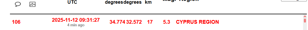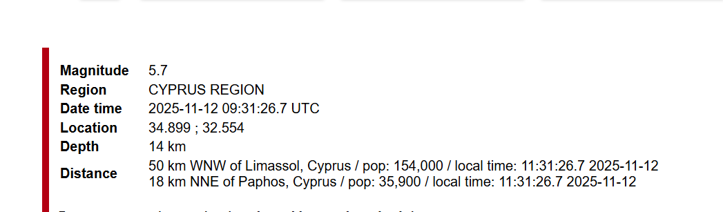 Ισχυρή σεισμική δόνηση σημειώθηκε το πρωί της Τετάρτης (12 Νοεμβρίου 2025) στην Κύπρο, προκαλώντας αναστάτωση στους κατοίκους κυρίως της Πάφου και της Λεμεσού.
