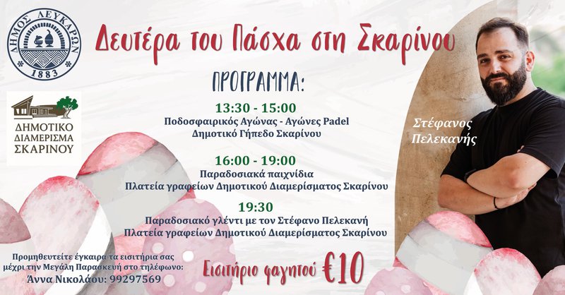 Η εκδήλωση αποτελεί μια μοναδική ευκαιρία για όλους να βρεθούν μαζί, να γιορτάσουν όπως παλιά και να μοιραστούν στιγμές γεμάτες χαμόγελα, παράδοση και αυθεντική φιλοξενία. Μην το χάσετε – ελάτε να γιορτάσουμε τη Δευτέρα του Πάσχα στη Σκαρίνου με τον τρόπο που ξέρουμε καλύτερα.