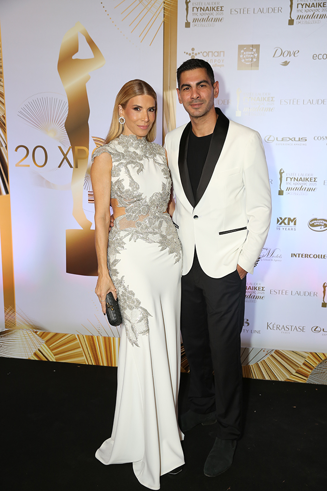 Η Έλενα ντύθηκε σε εμπνευσμένη couture γραμμή, με ένα λευκό gown με ασημένια ανάγλυφη δαντέλα, που θύμιζε μάρμαρο Αφροδίτης. Η εφαρμογή του φορέματος αγκάλιαζε τη σιλουέτα της, ενώ οι μεταλλικές λεπτομέρειες αντανακλούσαν το φως και τον δυναμισμό της.