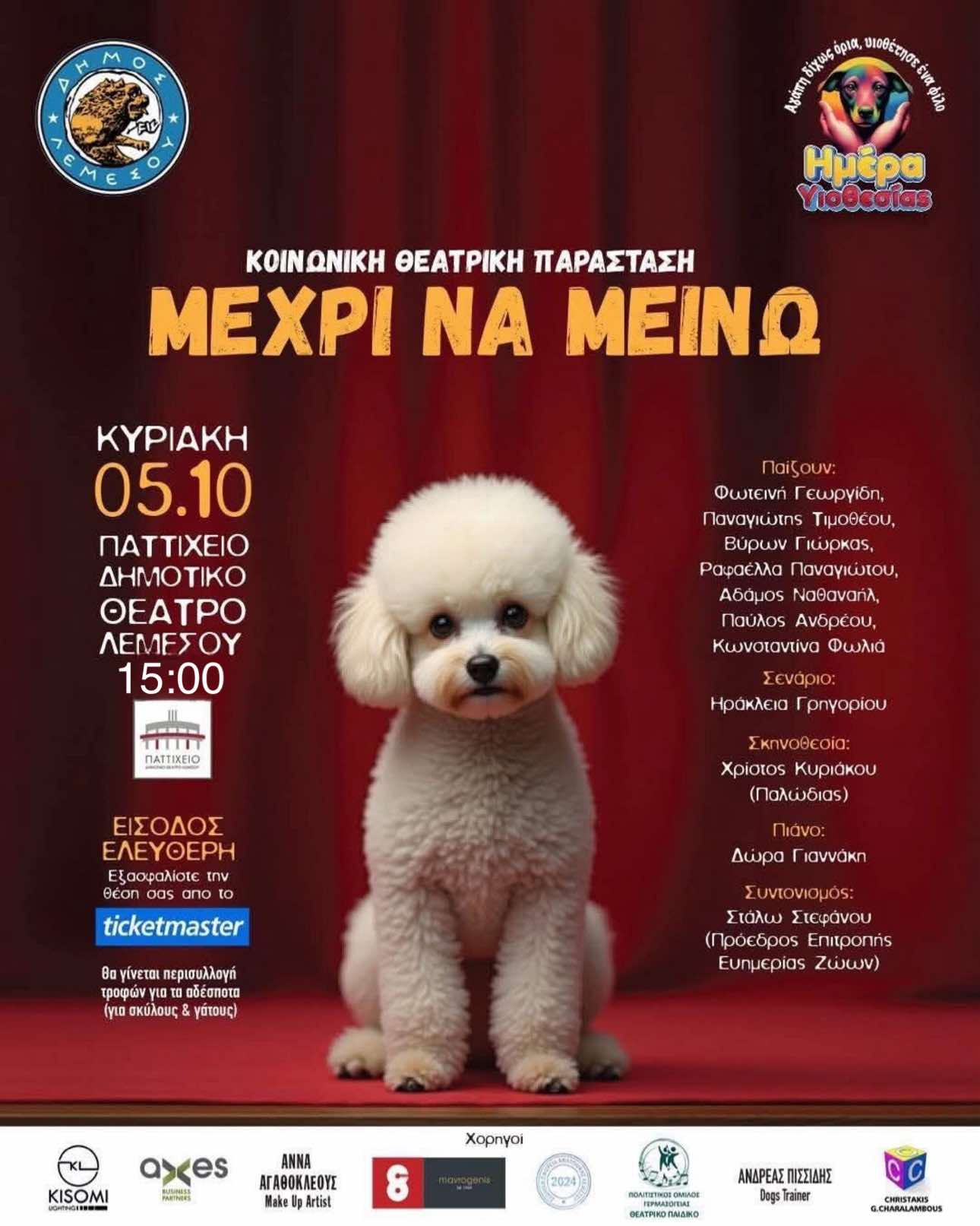 Στην Λεμεσό παρουσιάζεται η κοινωνική θεατρική παράσταση «Μέχρι να Μείνω» με στόχο την ευαισθητοποίηση γύρω από τη φιλοζωία και την υιοθεσία αδέσποτων ζώων. Είσοδος ελεύθερη στο Παττίχειο Θέατρο.
