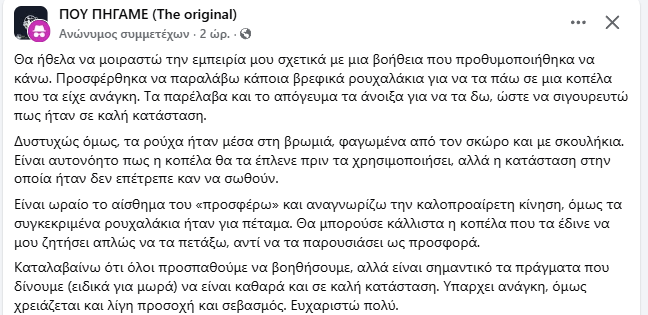 Μέλος της ομάδας ΠΟΥ ΠΗΓΑΜΕ (The original) περιέγραψε την εμπειρία του όταν προθυμοποιήθηκε να παραδώσει βρεφικά ρούχα σε μια μητέρα που είχε άμεση ανάγκη. Όταν όμως άνοιξε τις σακούλες για να ελέγξει την κατάστασή τους, ήρθε αντιμέτωπο με μια εικόνα απογοητευτική: